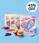 Unsere Sets bestehen zu 90 % aus recycelten und wiederverwertbaren Materialien, und unser Super-Ton ist vegan und tierversuchsfrei. Alle Materialien sind völlig ungiftig, sowohl für dich als auch für unseren Planeten.