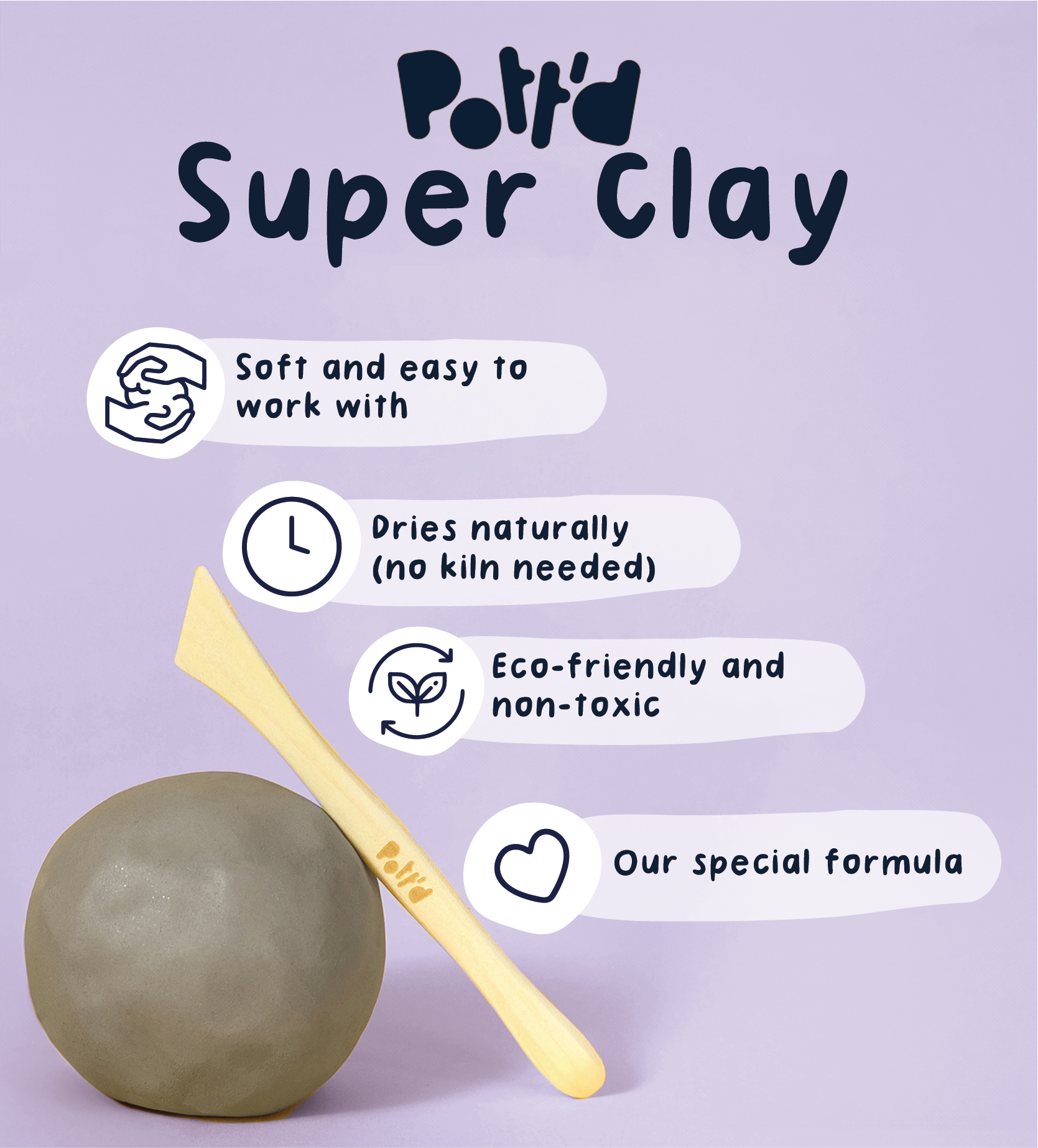 Unsere Sets bestehen zu 90 % aus recycelten und wiederverwertbaren Materialien, und unser Super-Ton ist vegan und tierversuchsfrei. Alle Materialien sind völlig ungiftig, sowohl für dich als auch für unseren Planeten.