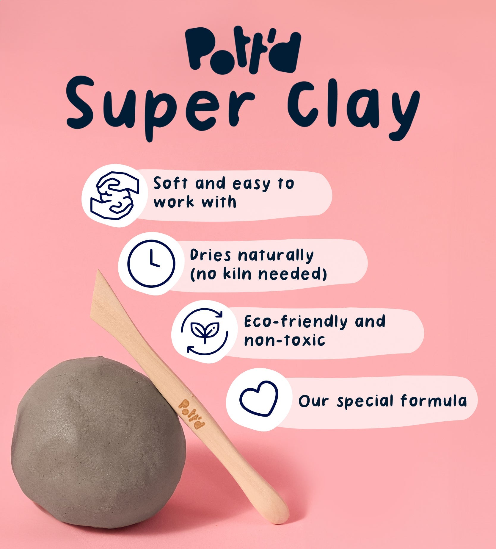 Our kits use 90% recycled and recyclable materials, and our Super Clay is vegan and cruelty-free. All materials are totally non-toxic, both for you and the planet.