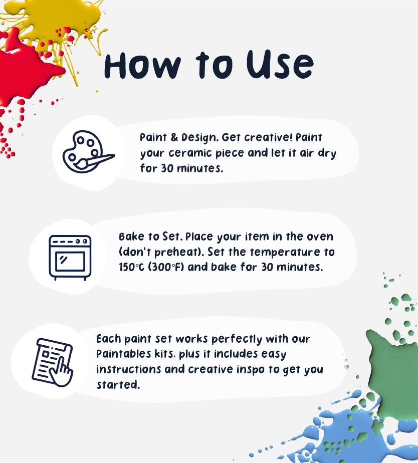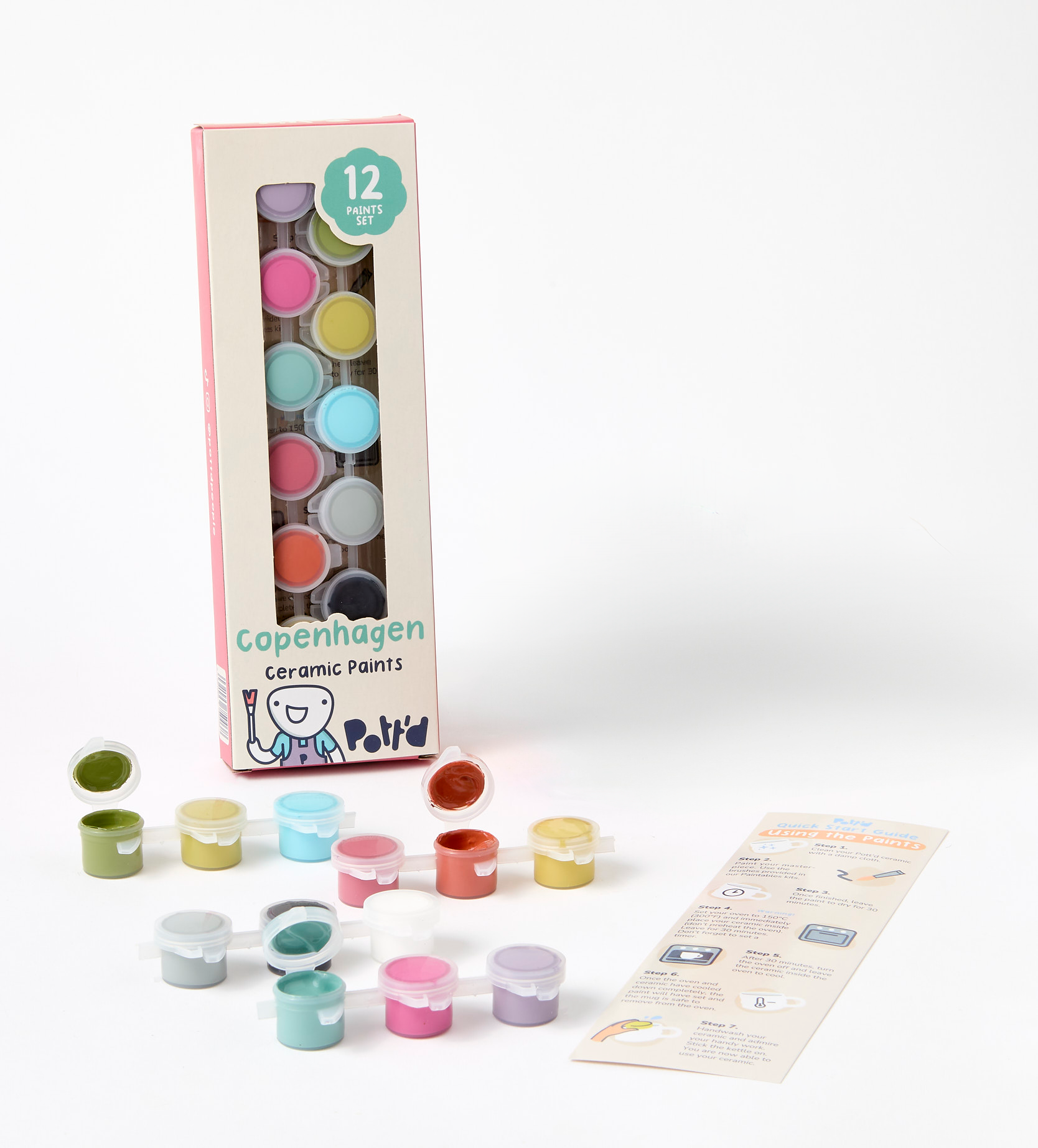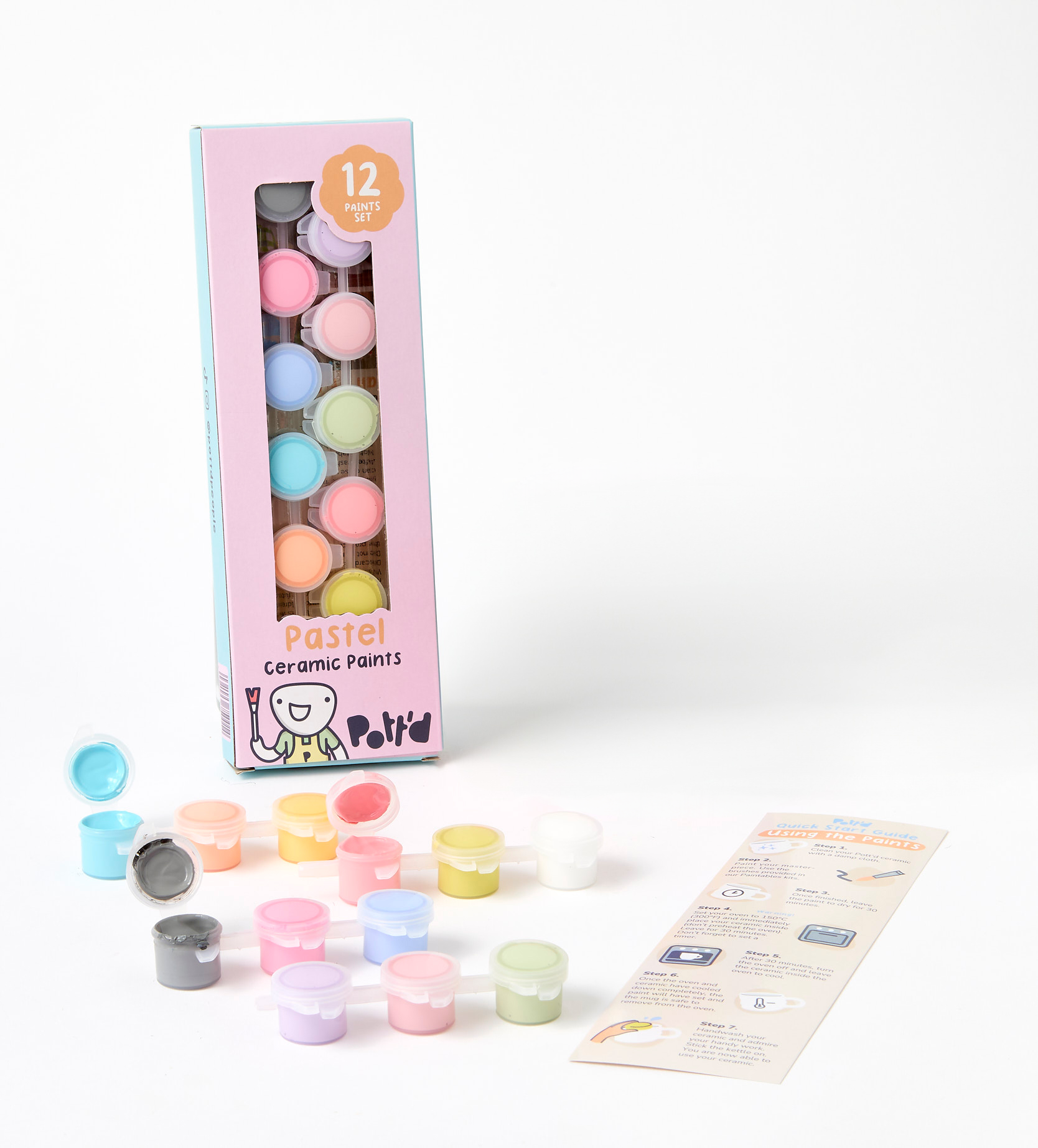 Give your creations a colourful boost with this set of 12 ceramic paints, specially designed for our painting kits. With a quick-start guide full of inspo, tips and colour combos, you’ve got everything you need to mix, match and bring your designs to life.