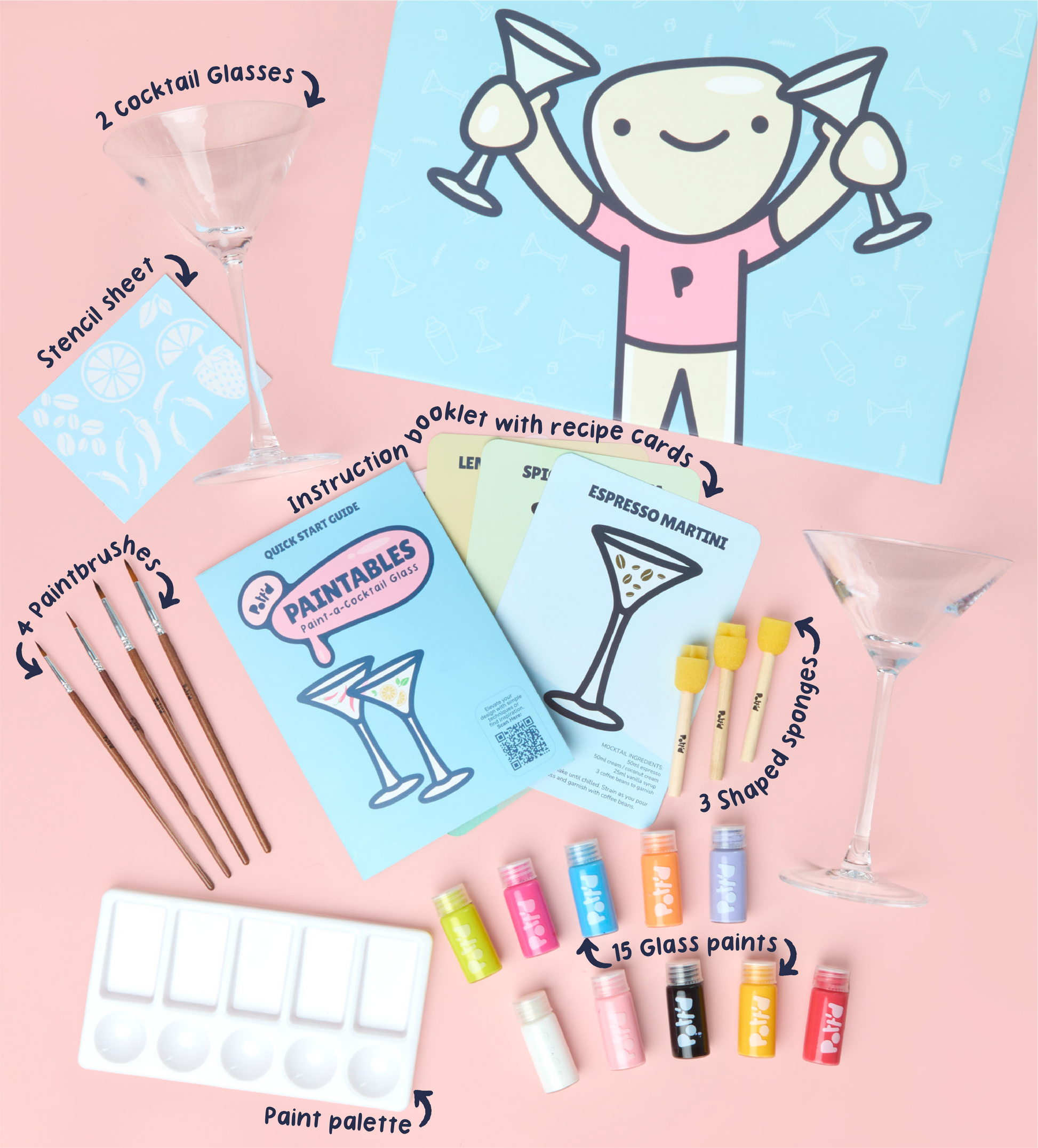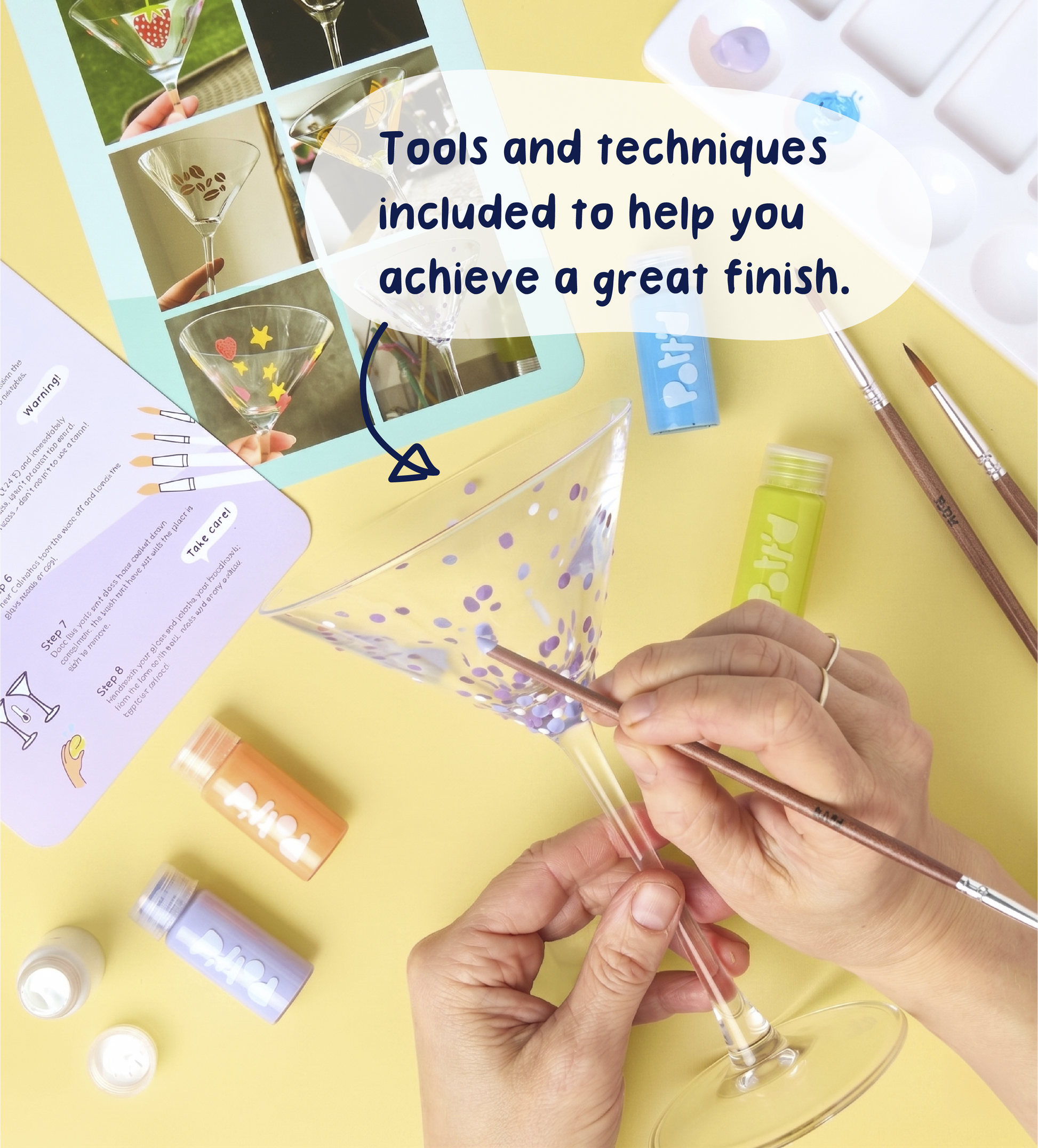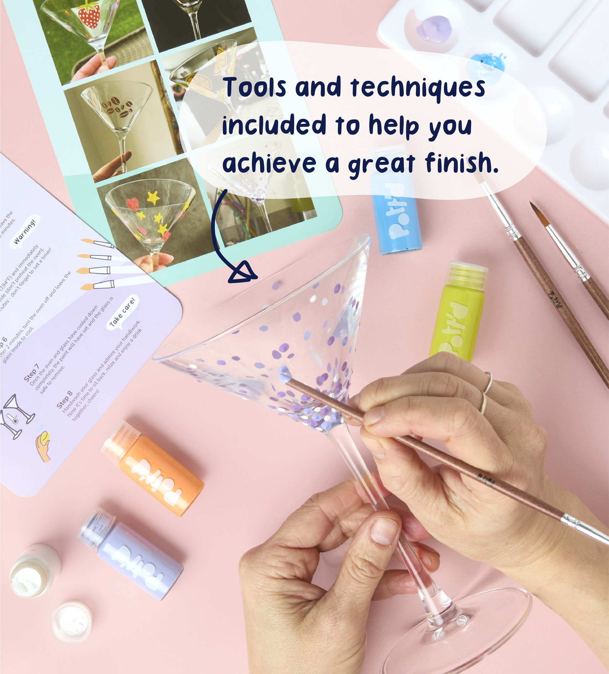 With easy-to-use glass paints, stencils and precision brushes, you can create everything from clean, minimal designs to bold, playful patterns. Follow the recipe cards for your next drink inspiration, then cure your design for a durable finish that’s ready for your next pour.