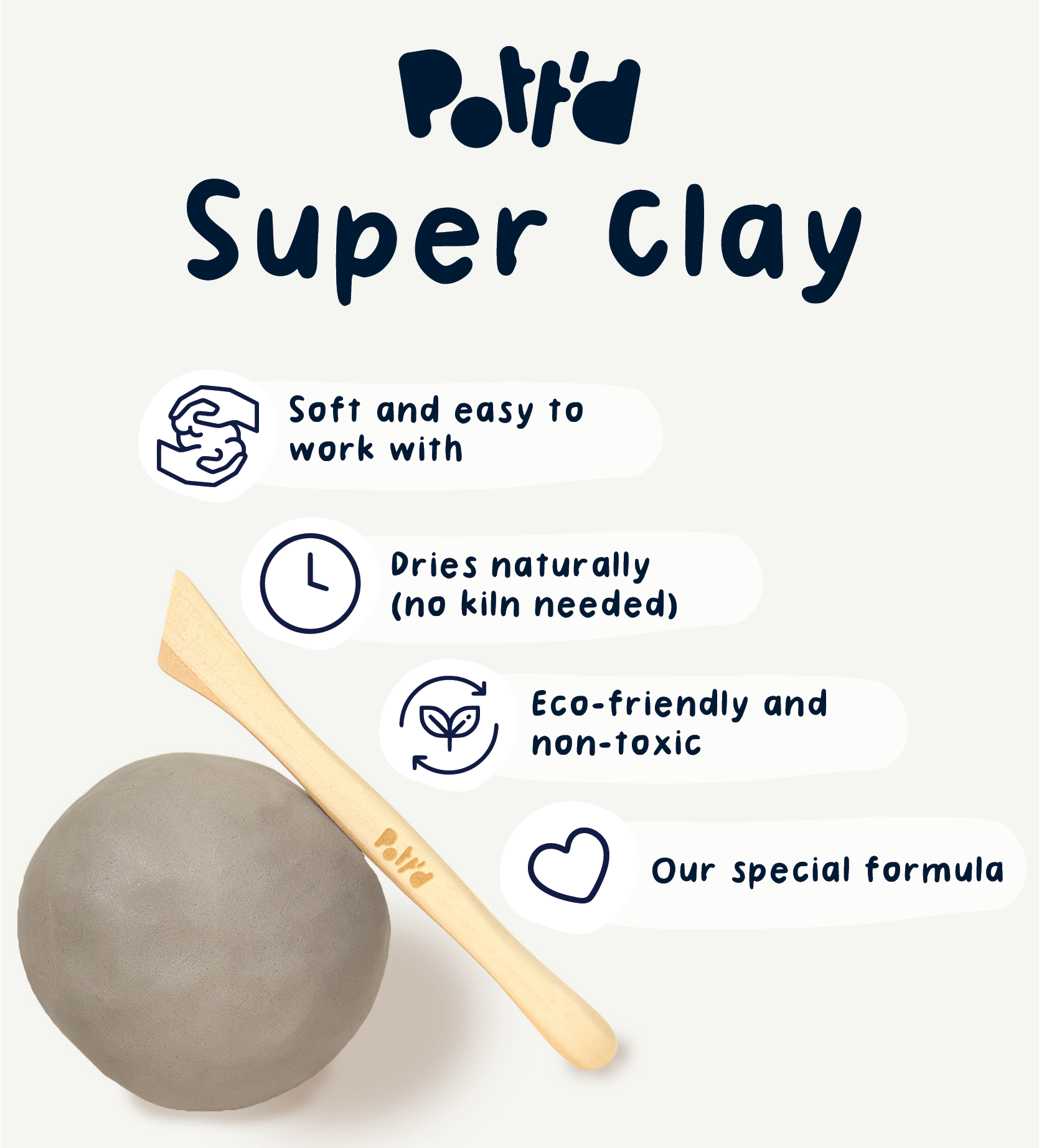 Our kits use 90% recycled and recyclable materials, and our Super Clay is vegan and cruelty-free. All materials are totally non-toxic, both for you and the planet.