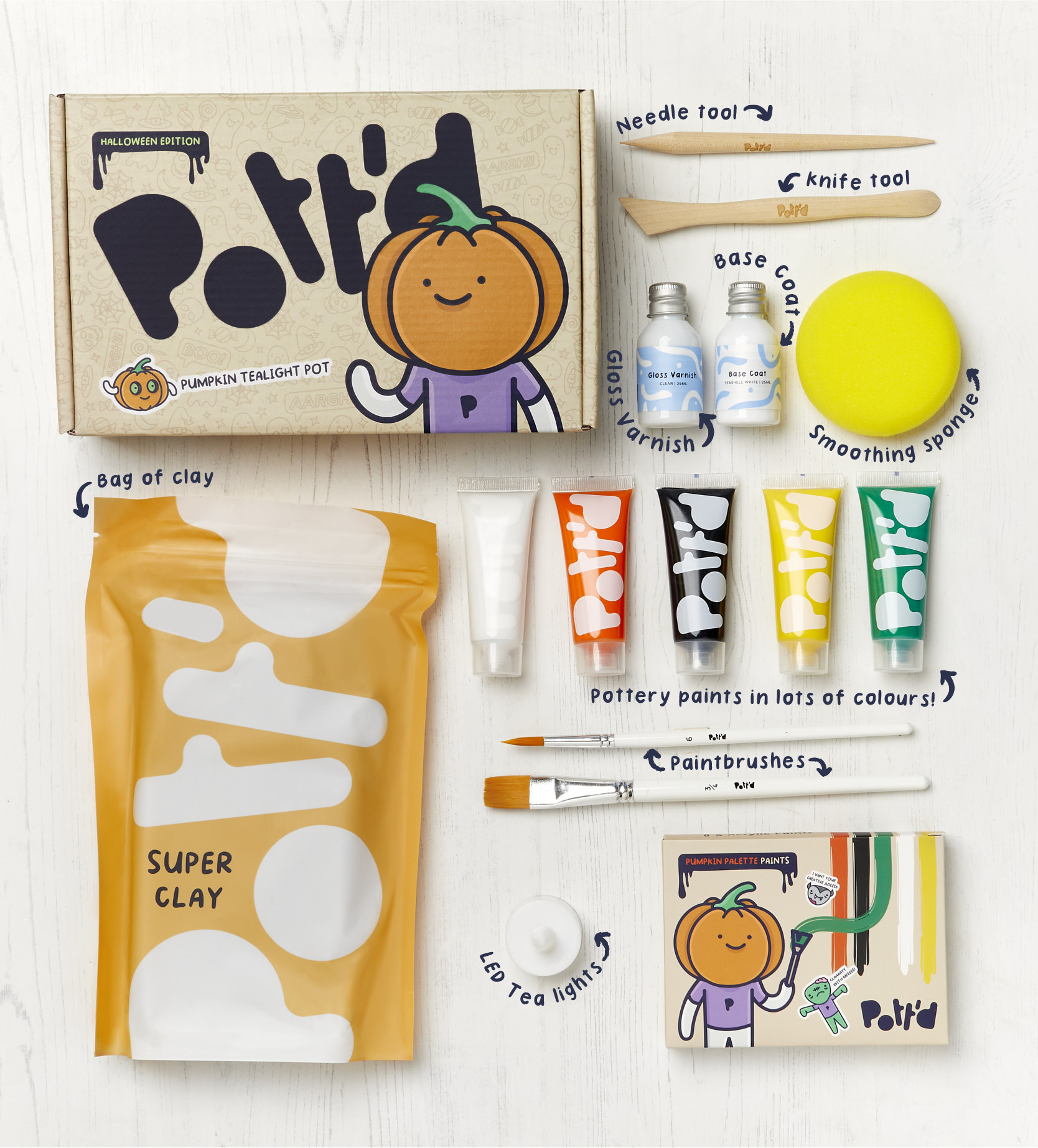 This kit includes everything you need to make your very own Pumpkin Tealight Pot. Add a warm, spooky glow to your Halloween nights. This cosy crafting kit lets you mould and paint your very own set of pumpkin-shaped candle holders, perfect for lighting up those dark autumnal evenings and getting in the spooky mood. Whether you're setting the scene for a Halloween party or adding a festive touch to your home, these cute pumpkin holders will bring the perfect blend of eerie ambiance and autumn cosiness 🎃