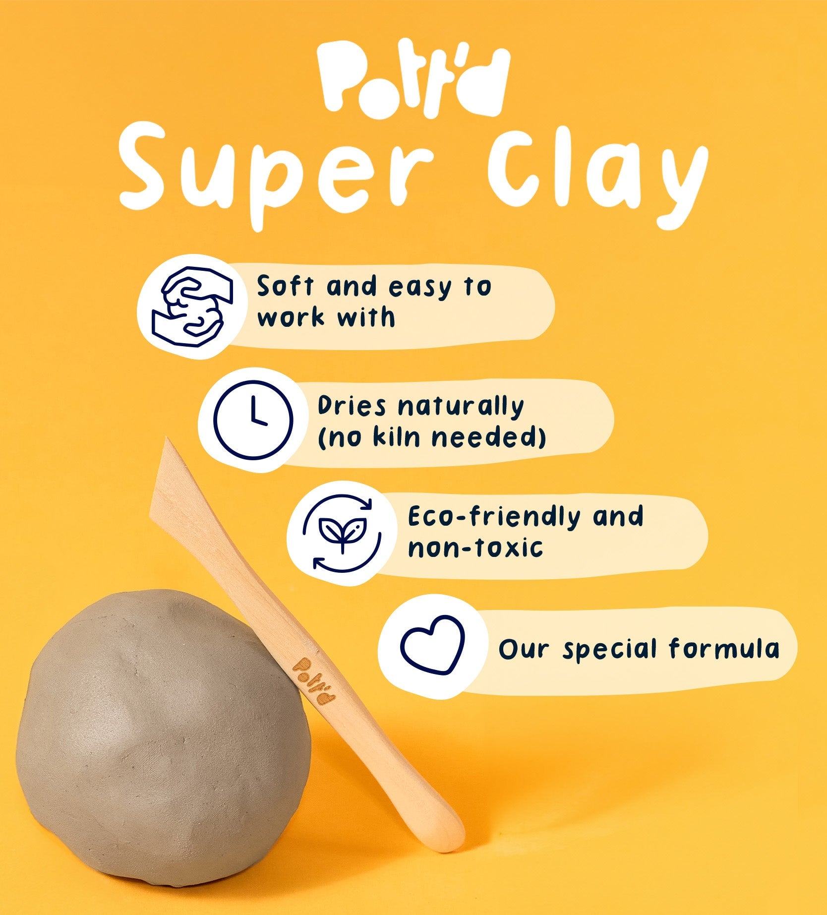 Our kits use 90% recycled and recyclable materials, and our Super Clay is vegan and cruelty-free. All materials are totally non-toxic, both for you and the planet.