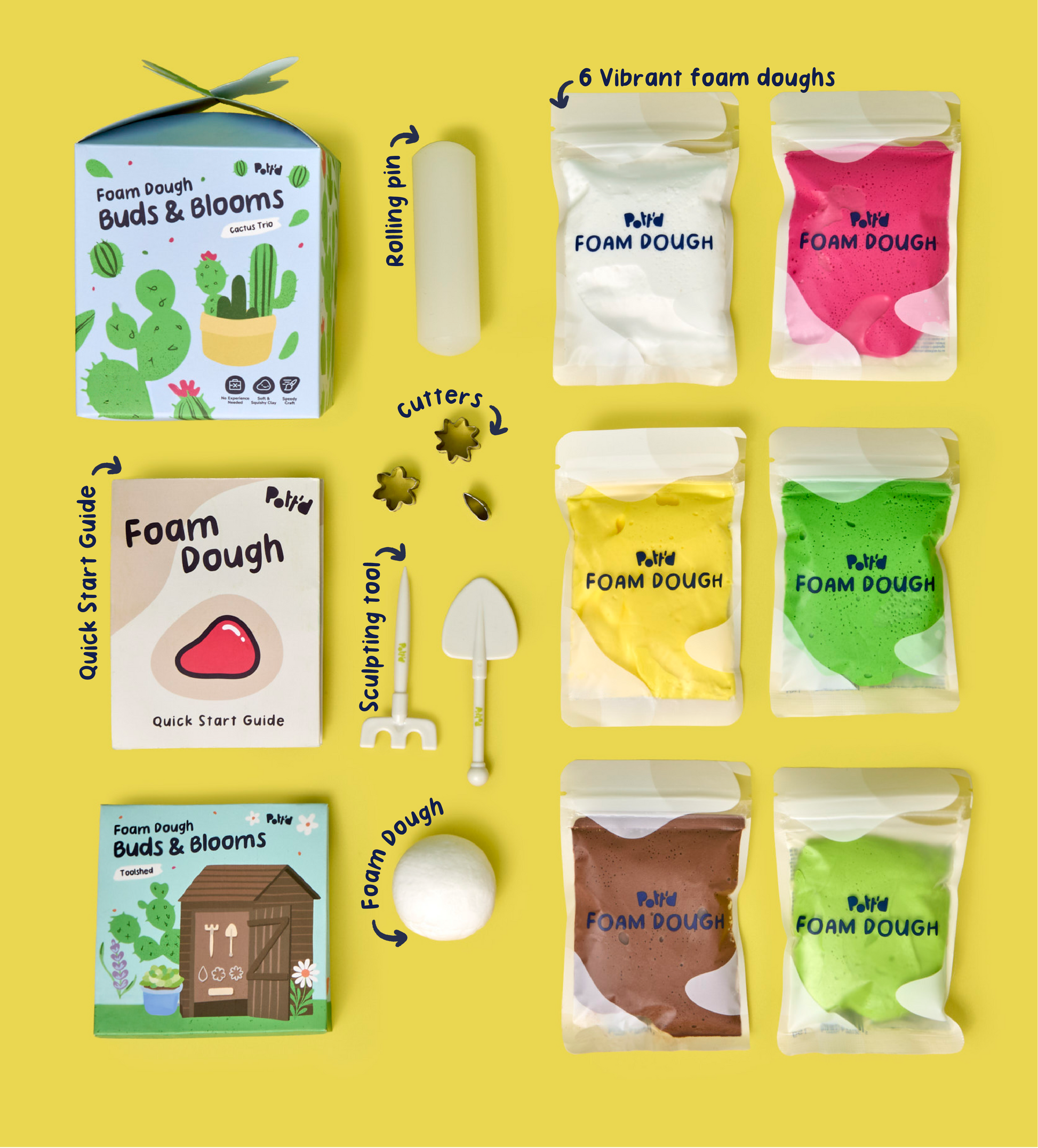 Triple the charm with the Cacti Trio from the Buds & Blooms Foam Dough Collectibles! This set lets you sculpt three unique mini cacti using Pott’d’s light, squishy foam dough. Fun to mould, air-drying, and mess-free, it’s the perfect way to create a tiny desert garden that never needs water. 🌱