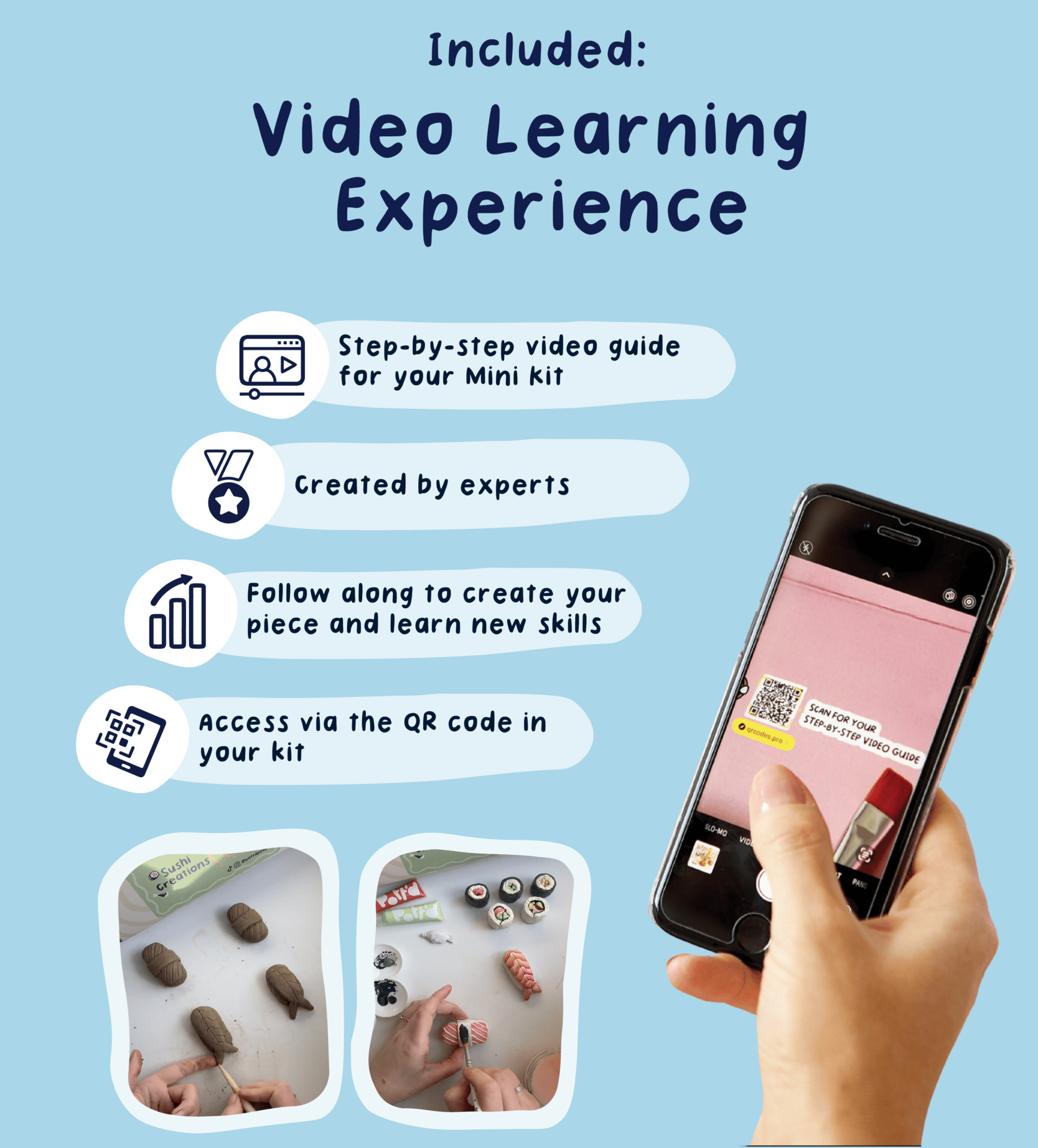 Scanne le QR code sur l’autocollant extérieur du carton, pour accéder à tes tutoriels en ligne de modelage et peinture sur argile, conseils et guide de soin – tout est minutieusement préparé par notre équipe créative.