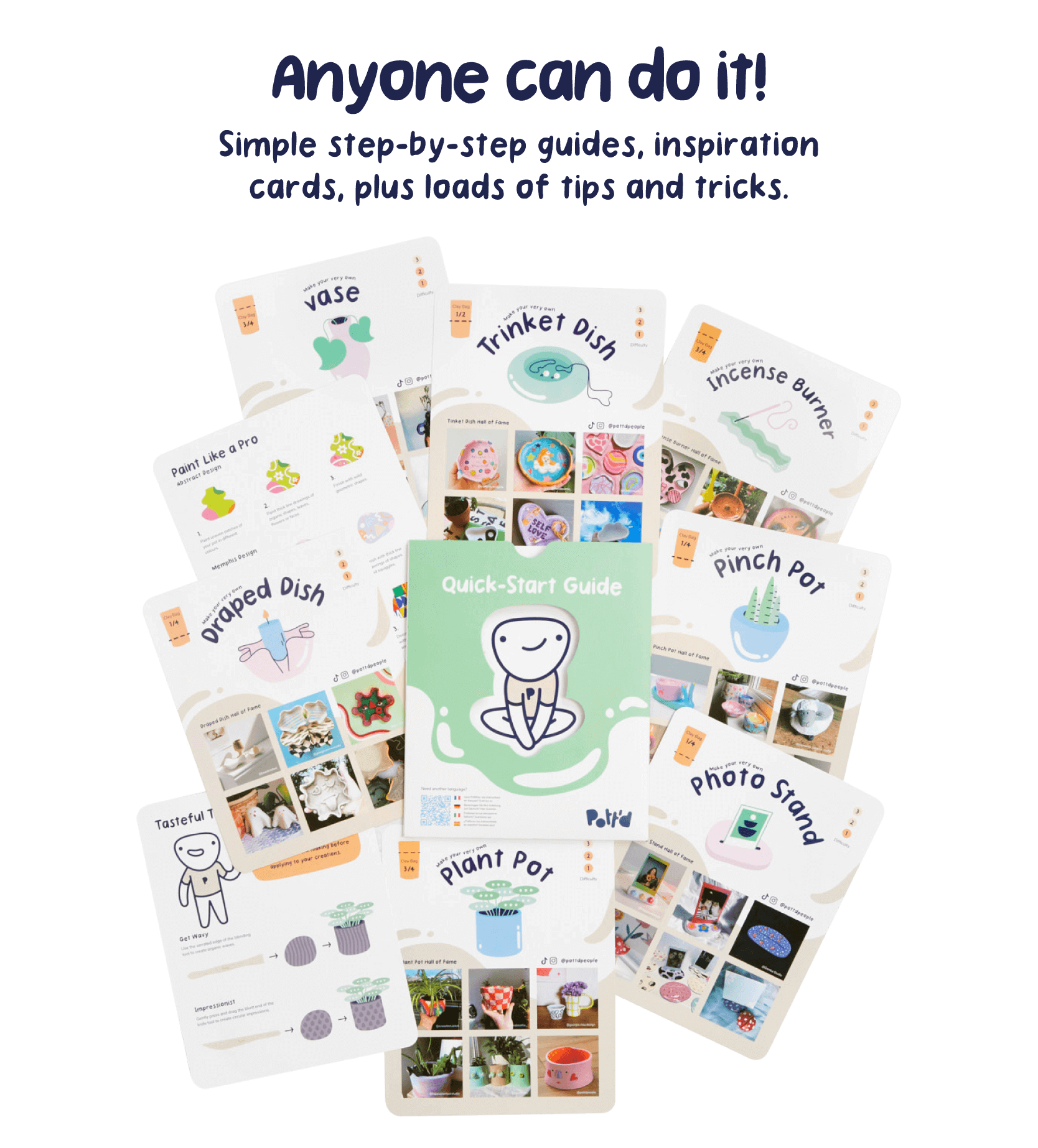 📝 1 x Pott’d quick-start guide with step-by-step instructions, and inspiration cards to create a whole bunch of creative pottery